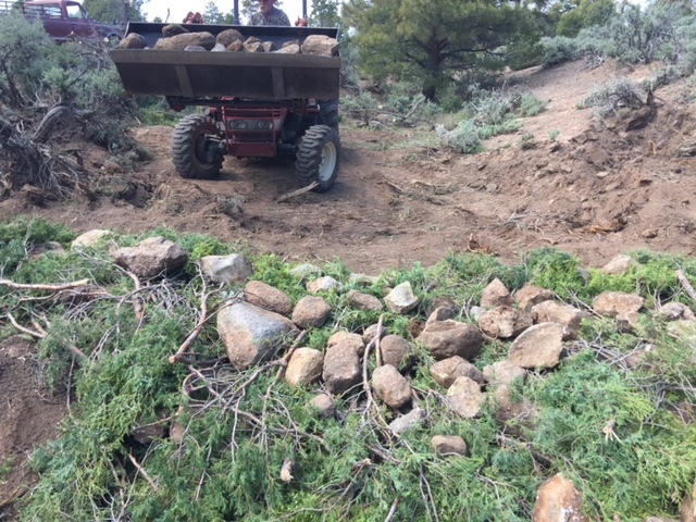 1. Erosion control dams - built out of layers of rock and brush to filter back dirt, slowing water flow reducing erosion. Five dams were built in a large ditch suffering from long term water runoff. Completed July/August 2017.